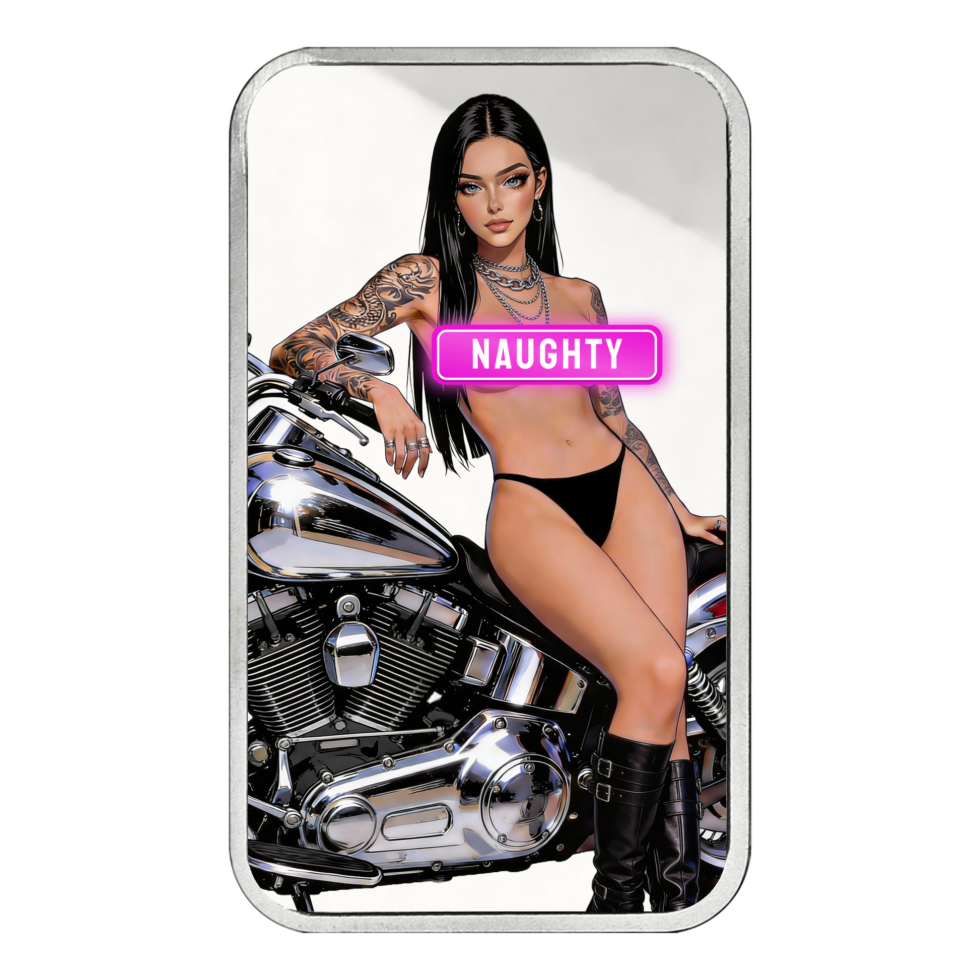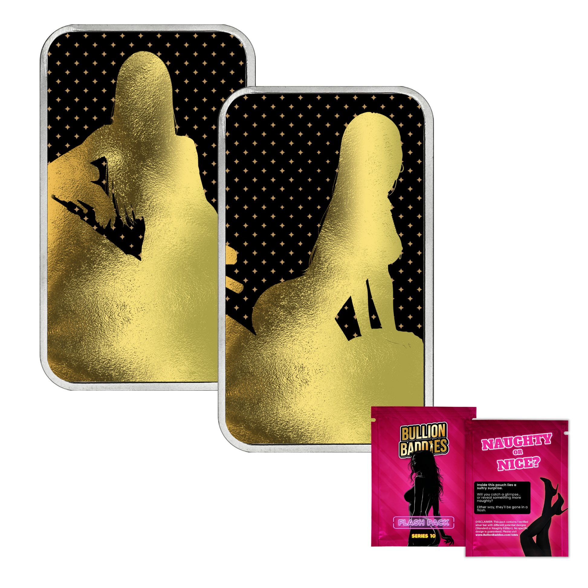 This Flash Pack release captures Rina in six Naughty-only designs, featuring daring front and back artwork that fully embraces her rebel edge. From her signature look to the bold No Limits and Colorway variations, each piece is struck in .999 fine silver using the BaddiesG2 bar style with raised logo and fineness hallmark. Every bar comes encapsulated, blind pouched, and paired with a Certificate of Authenticity, all locked into a total mintage of just 250.